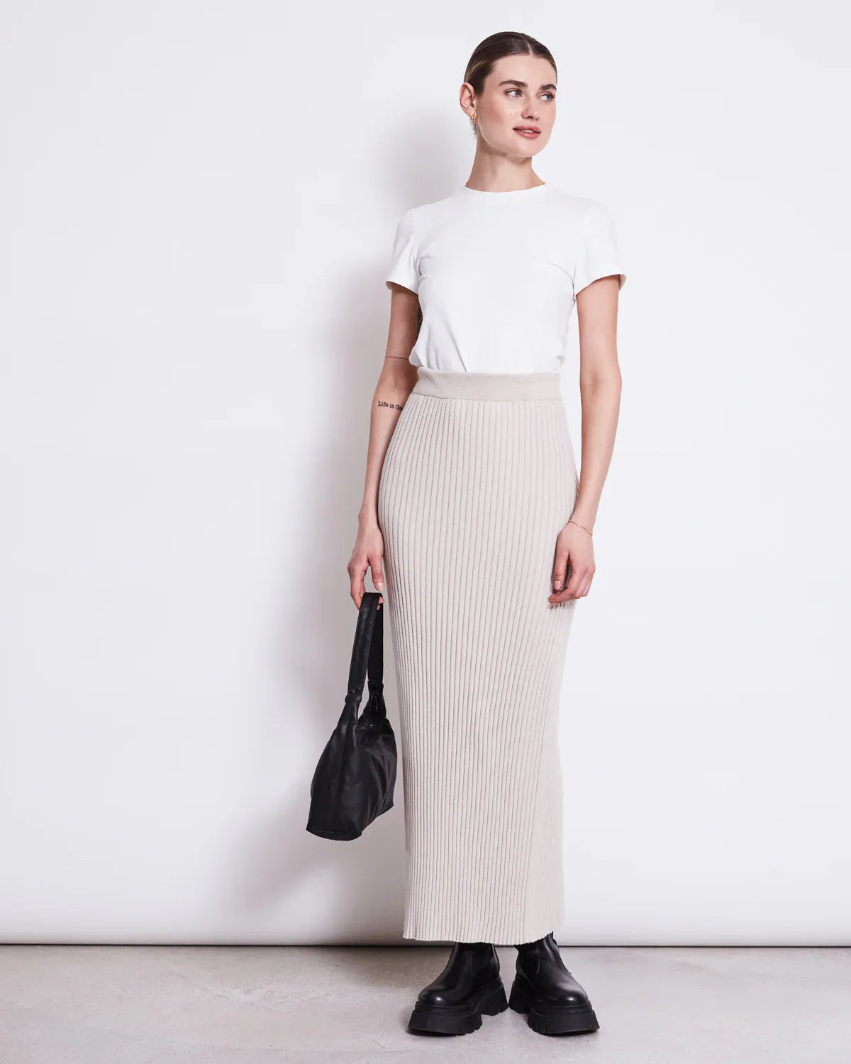 Hi EBBA! Our knitted skirt EBBA is made of super soft organic cotton. The skirt features a rib texture and a rather tight fit although it really embraces your body type.