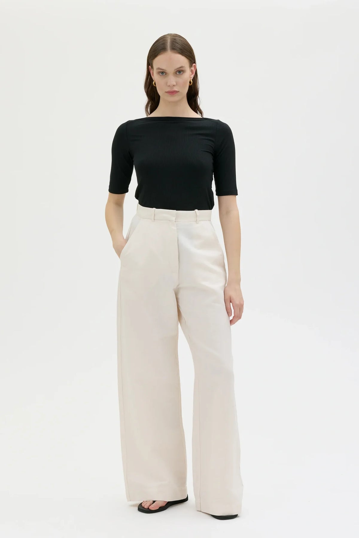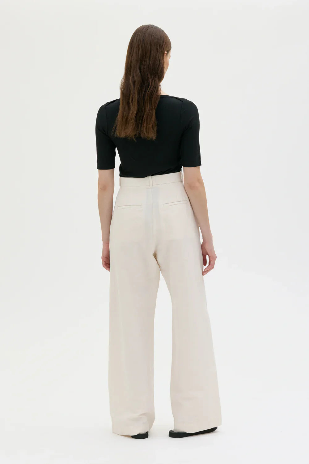 Hana buxurnar eru síðar, víðar og með afslöppuðu sniði sem gefur nútímalegt og fágað yfirbragð. Þær eru saumaðar úr hágæða efnisblöndu af lífrænni bómull, hör og lyocell sem fellur fallega og skapar mjúkt, flæðandi útlit.