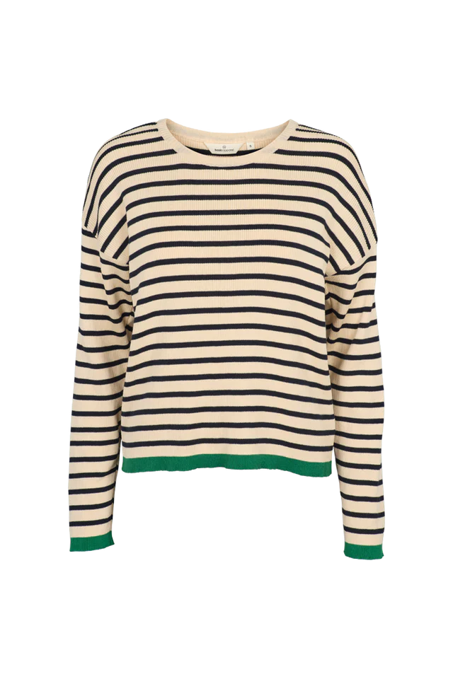 Lila Sweater er létt prjónuð bómullarpeysa með röndum, hringlaga hálsmáli og síðum ermum sem skapar áreynslulaust og tímalaust útlit. Lauslegt snið gerir hana einstaklega þægilega og fullkomna í hversdagslegar samsetningar.