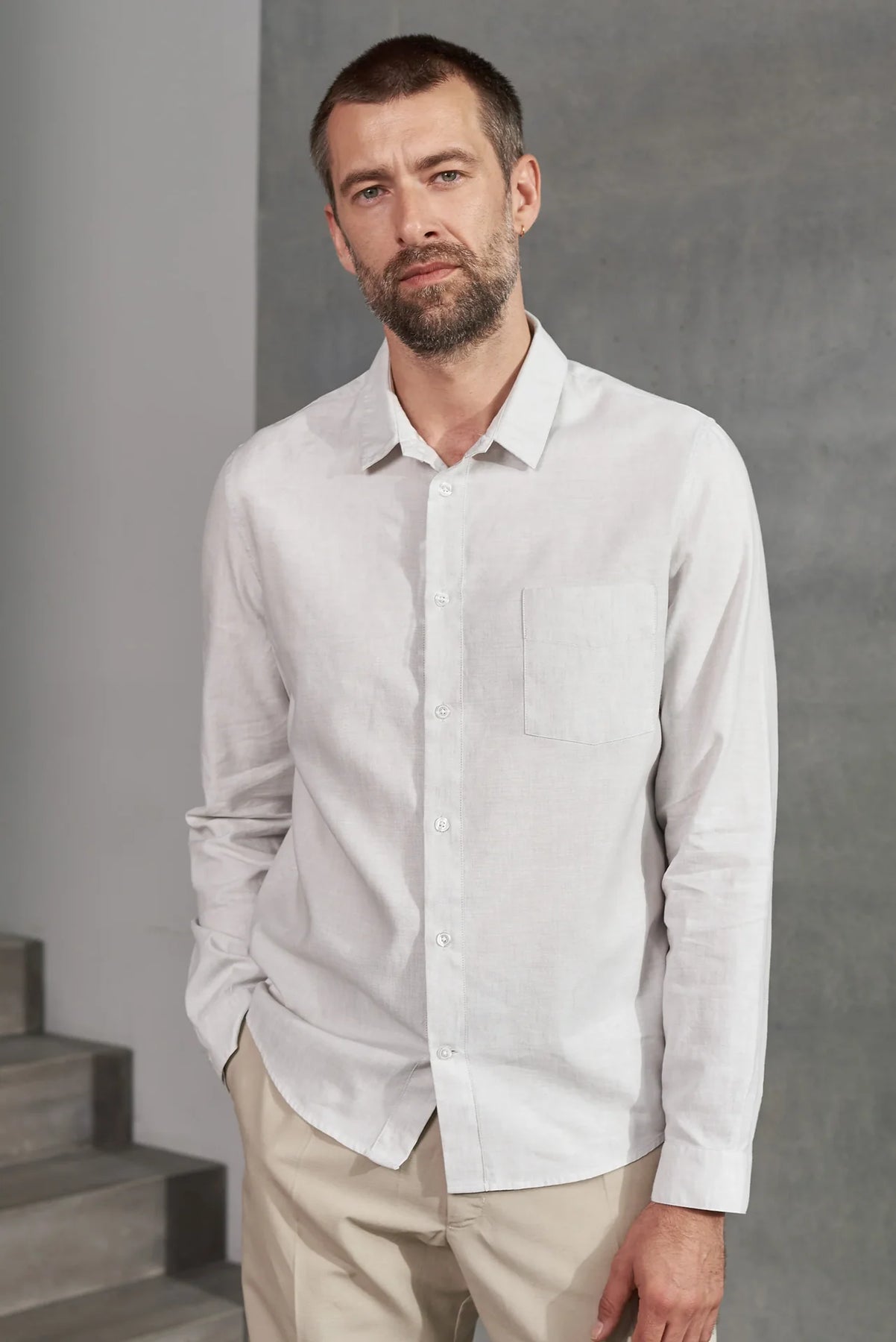 Efnisblandan sameinar mýkt lífrænnar bómullar og kælandi eiginleika hörsins, sem gerir skyrtuna þægilega í notkun allan daginn.