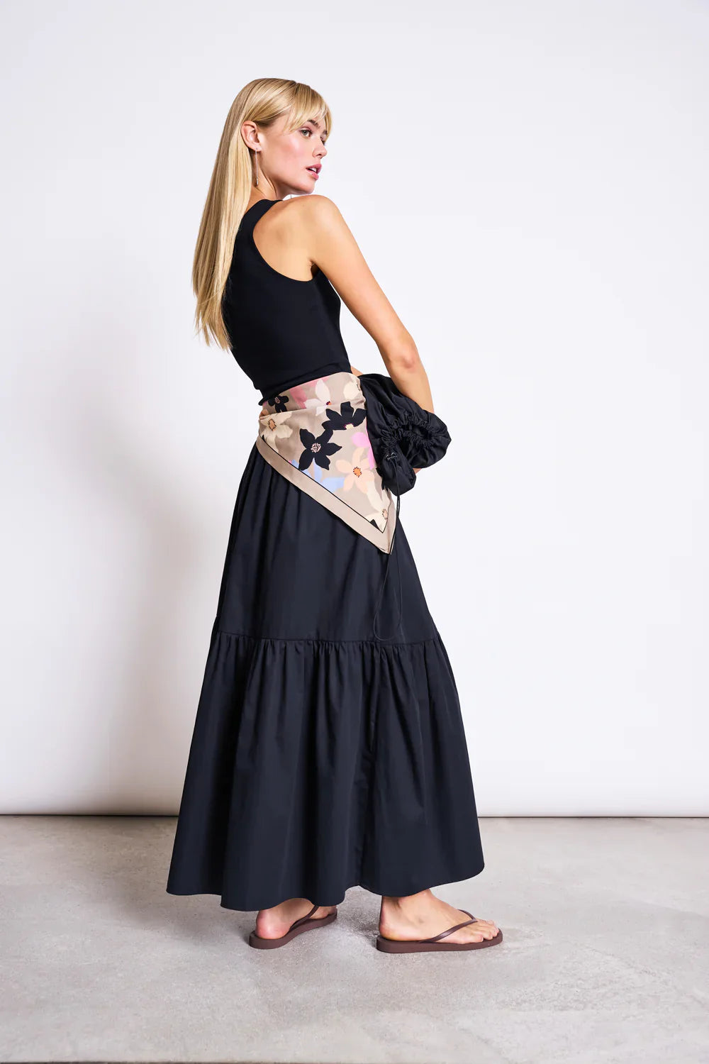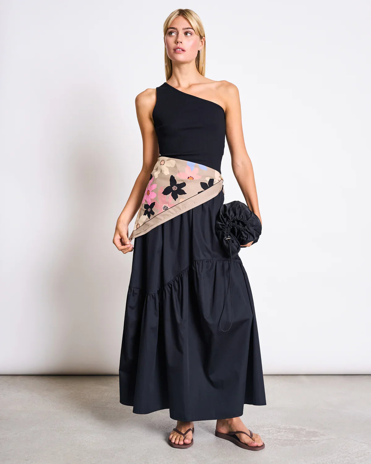 Þessi toppur er örlítið styttri í sniði og ermalaus, með hreinu one-shoulder hálsmáli sem gefur nútímalegt og fágað yfirbragð. Neðst er mjúkur rykktur kantur sem bætir við léttleika og hreyfingu.