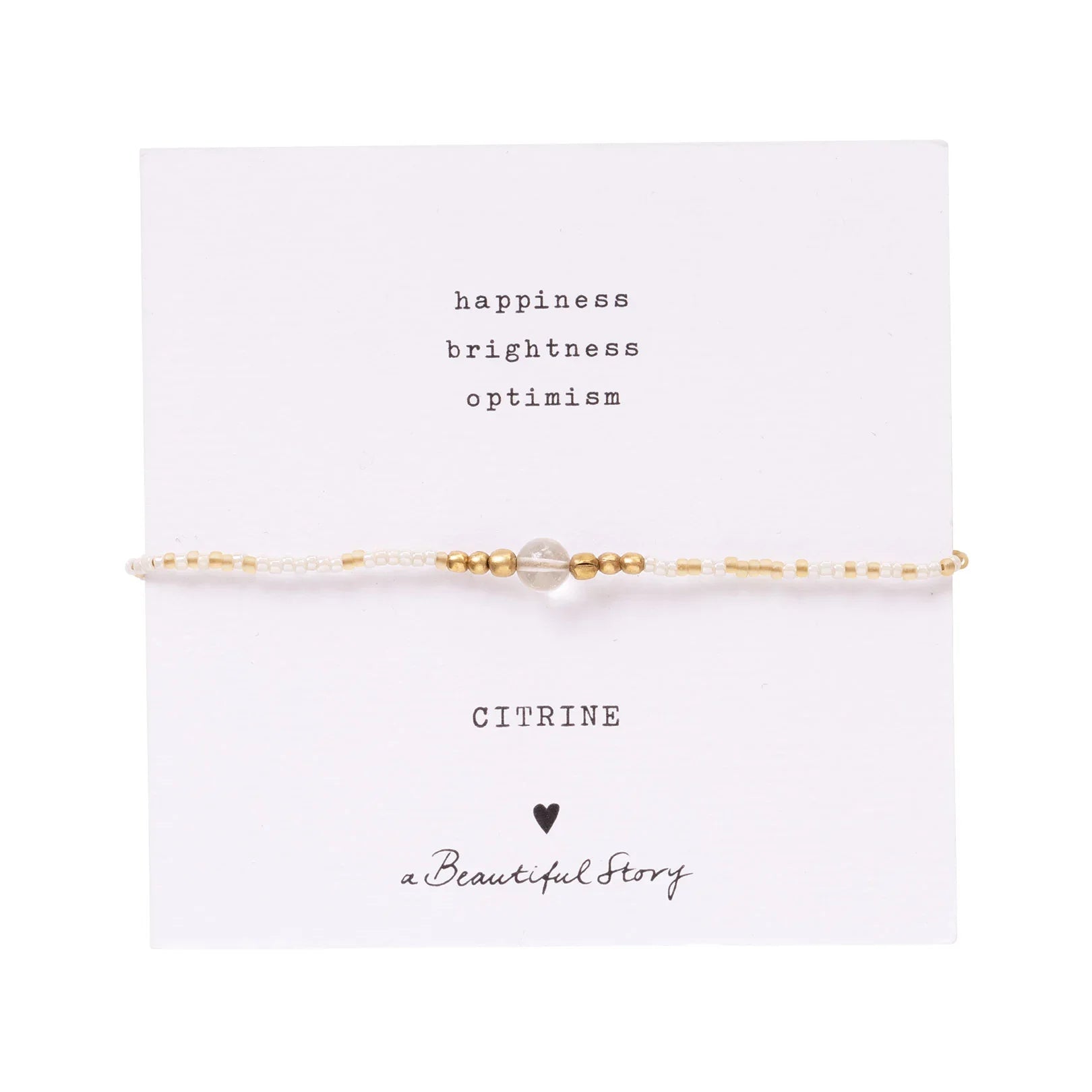Kynnum Iris Kort Citrine Gold Colored armbandið frá A Beautiful Story. Armbandið er handgert og unnið úr bómullarþræði, glerperlum og messingperlum, með litlum Citrine gimsteini sem fallegri áherslu.