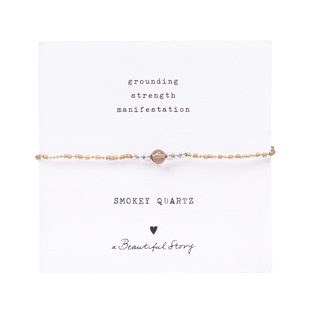 Kynnum Iris Kort Smokey Quart Gold Colored armbandið frá A Beautiful Story. Armbandið er handgert og unnið úr bómullarþræði, glerperlum og messingperlum, með litlum Smokey Quart gimsteini sem fallegri áherslu.