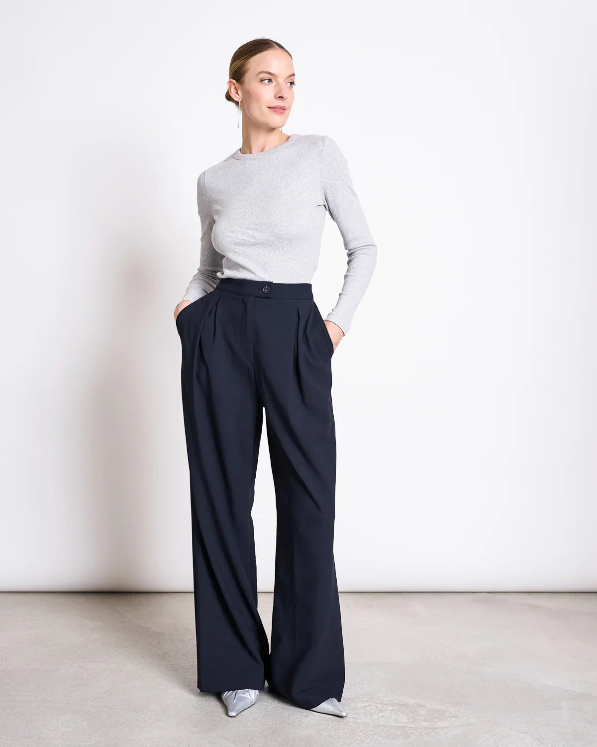Stílhreinar og tímalausar buxur sem sameina þægindi og fágaðan stíl. Háar í mittið með klassískum plíseringum að framan og víðu sniði sem fellur fallega – fullkomnar bæði í vinnuna og viðburði á kvöldin.