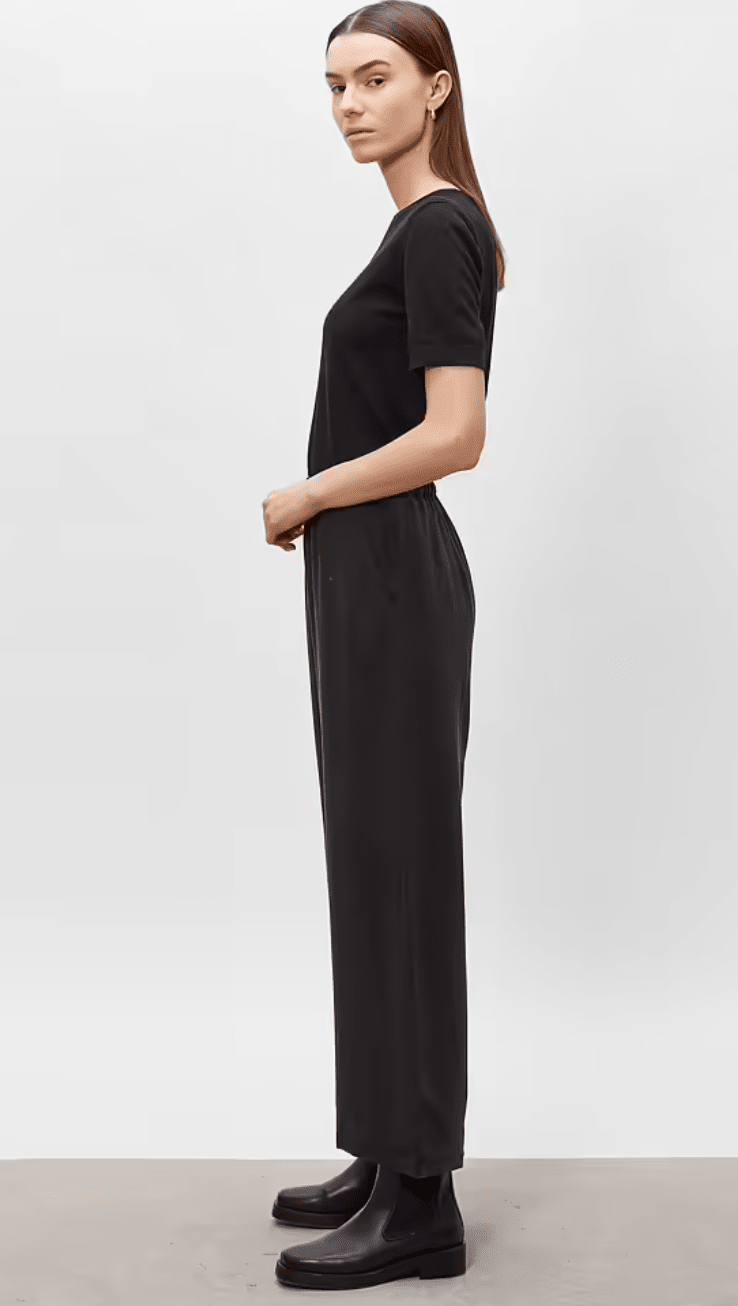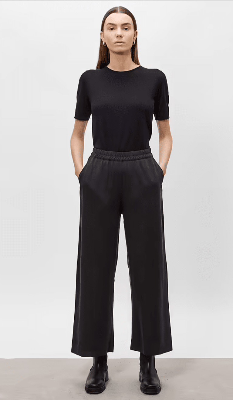 Pants with elastic waist. Slightly cropped and wide leg with normal waist and fit. Two side pockets. Back darts. Reinforced with stitching at back crotch seam. Made in a durable medium weight twill tencel fabric.