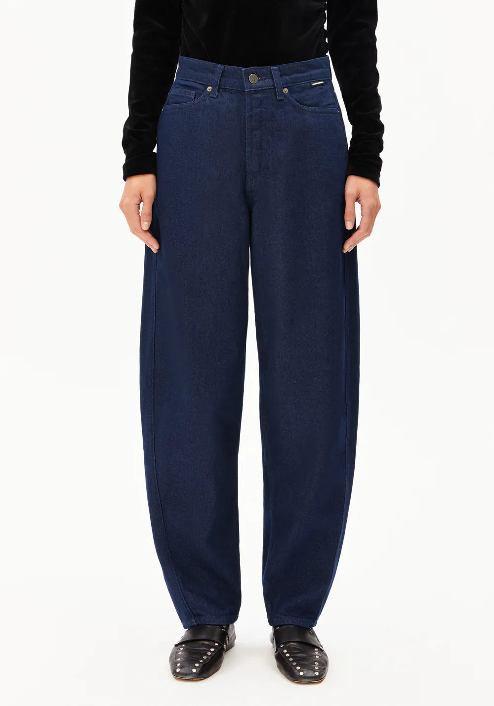 BAARELL AIRGLOW eru gallabuxur með nútímalegu og kúl sniði sem einkennist af því að vera víðar yfir lærin og þrengjast niður að ökklum – svokallað barrel fit. Þær eru með háu mitti, mjúkum en sterkum saumi og eru saumaðar úr 100% GOTS-vottaðri lífrænni bómull, án teygju, sem gefur þeim ekta gallafíling og form sem þróast með notkun.