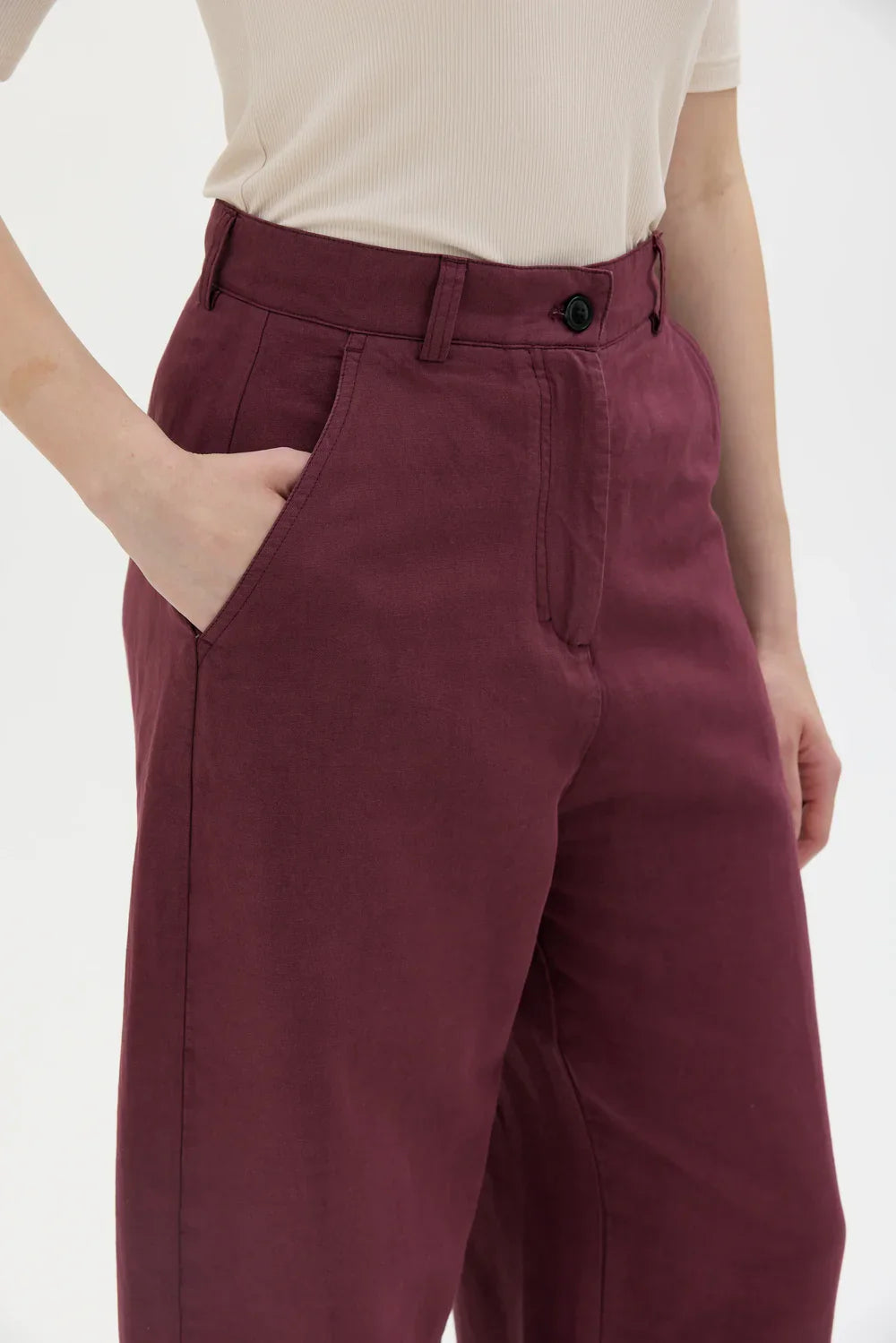Hisa buxurnar eru með víðu, styttra sniði (cropped) og lægra klofi, og eru með bæði vasa að framan og aftan. Þær eru gerðar úr hágæða efnisblöndu af lífrænni bómull, hör og lyocell, sem hefur fallega áferð og mjúkt, flæðandi fall.