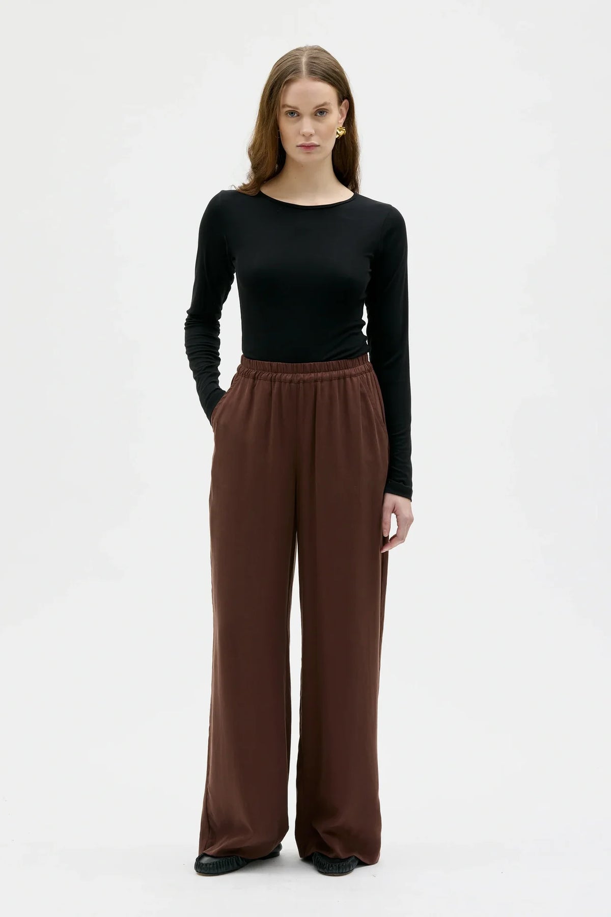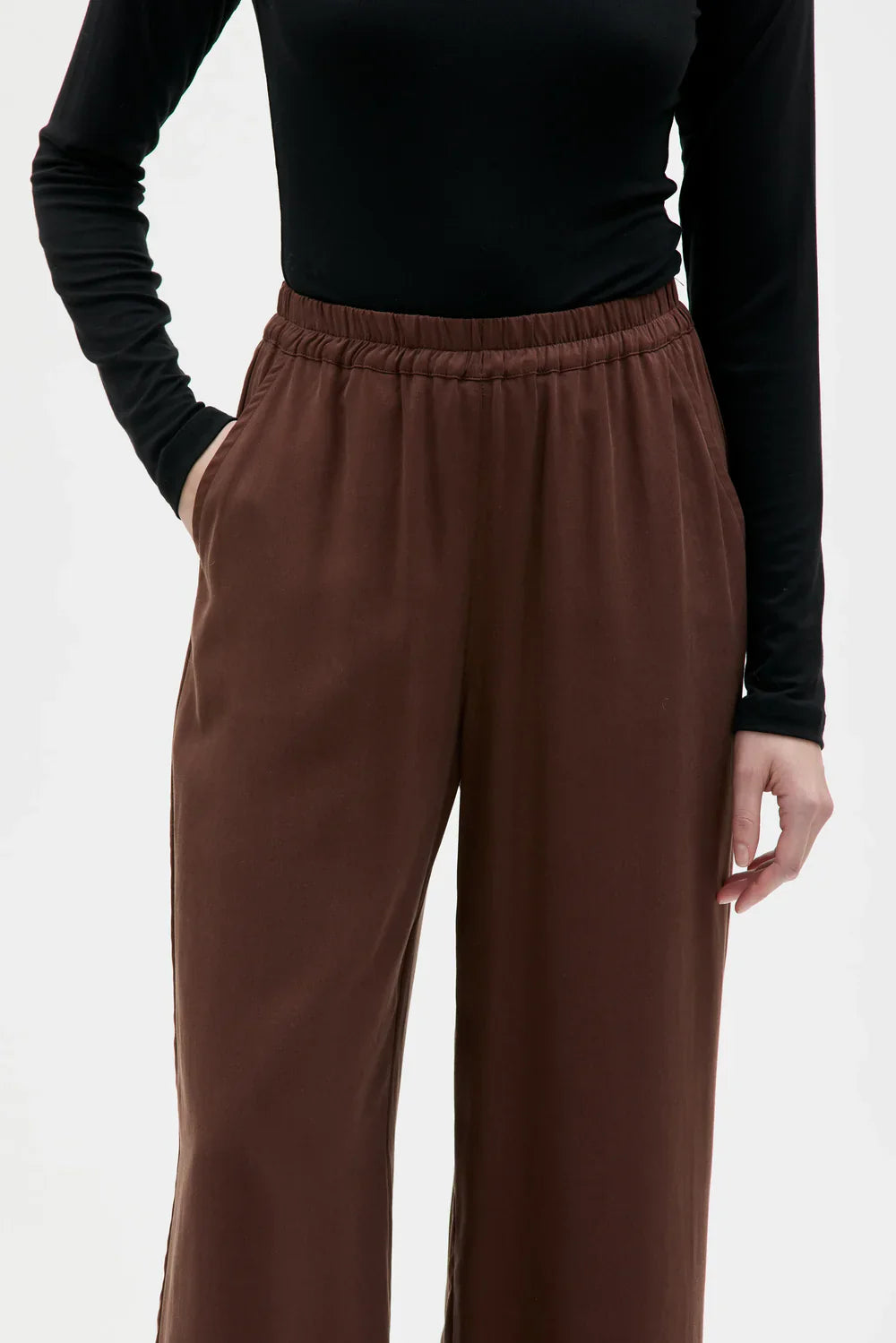 Tela is our new elongated version of Thea, featuring long wide legs, an elastic waist, and side slip pockets. These trousers are crafted from durable, medium-weight twill Tencel fabric with a soft hand feel and elegant drape. Pair Tela with a tucked-in fine knit top or a chunky knit sweater with sandals for a cool yet polished look.